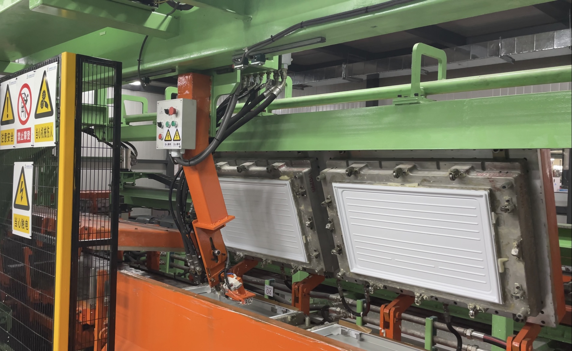 全自動冰箱門體發(fā)泡生產(chǎn)線屬于環(huán)形式門體發(fā)泡生產(chǎn)線,為水平地面環(huán)形結(jié)構(gòu)布置,采用自動澆注,自動取件,可不停線生產(chǎn)各種不同型號的冰箱門體的發(fā)泡,多種產(chǎn)品可在線上混線生產(chǎn),線體運(yùn)行速度可自行調(diào)節(jié),大大提高生產(chǎn)節(jié)拍,其中鏈輪驅(qū)動,機(jī)械開模,機(jī)械合模的穩(wěn)定結(jié)構(gòu),減少了設(shè)備的故障率。